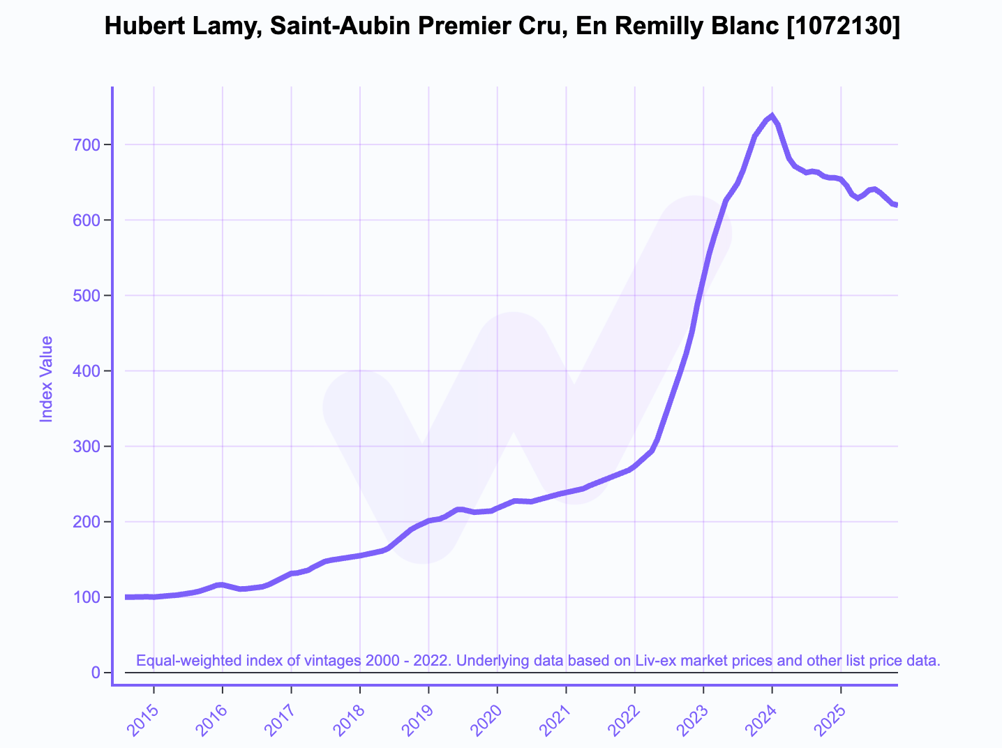 Hubert Lamy has quickly become one of Burgundy’s standout producers, combining exceptional quality with impressive market performance. The domaine’s flagship Saint-Aubin “En Remilly” has delivered a 10-year CAGR of 19.5%, making Lamy one of the region’s best recent performers.