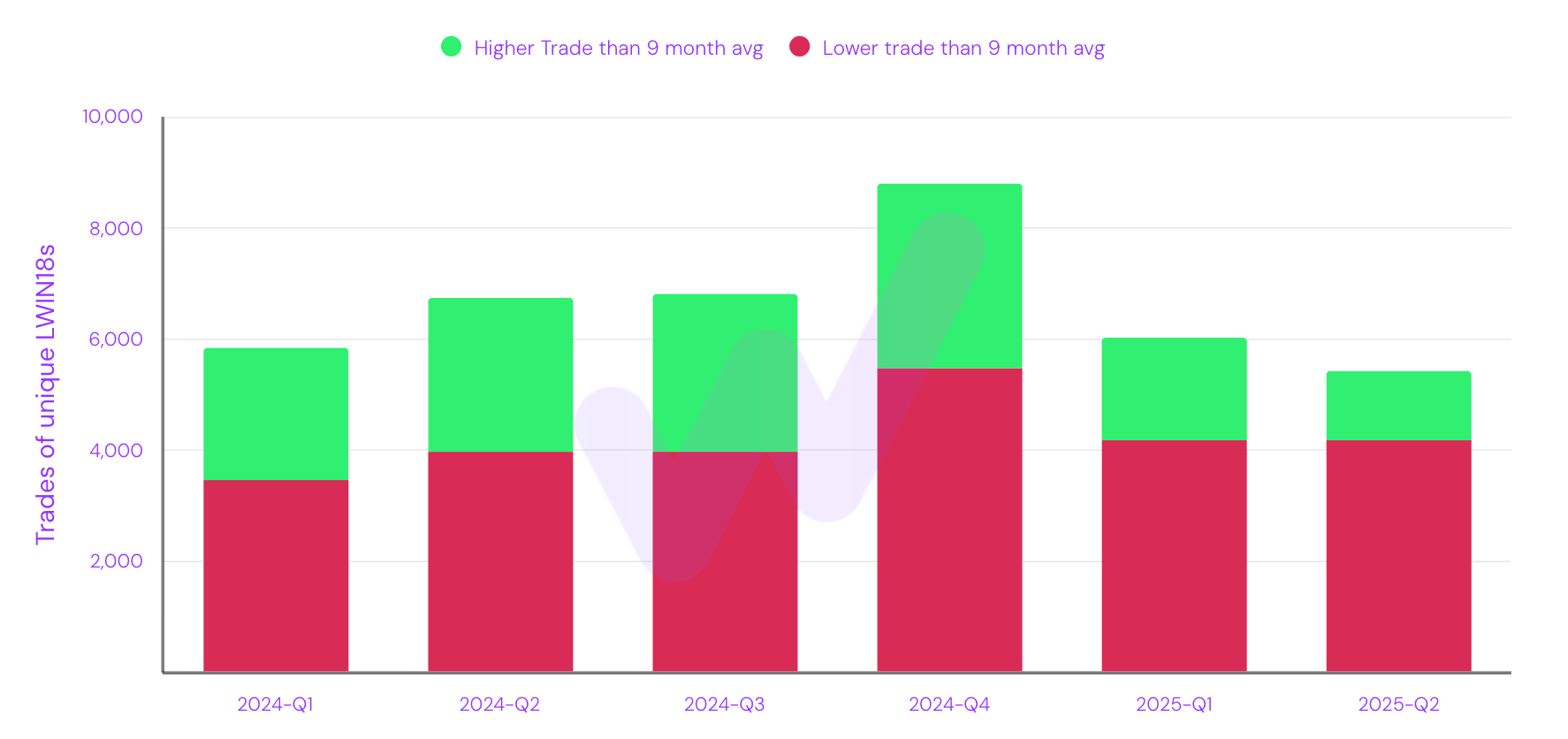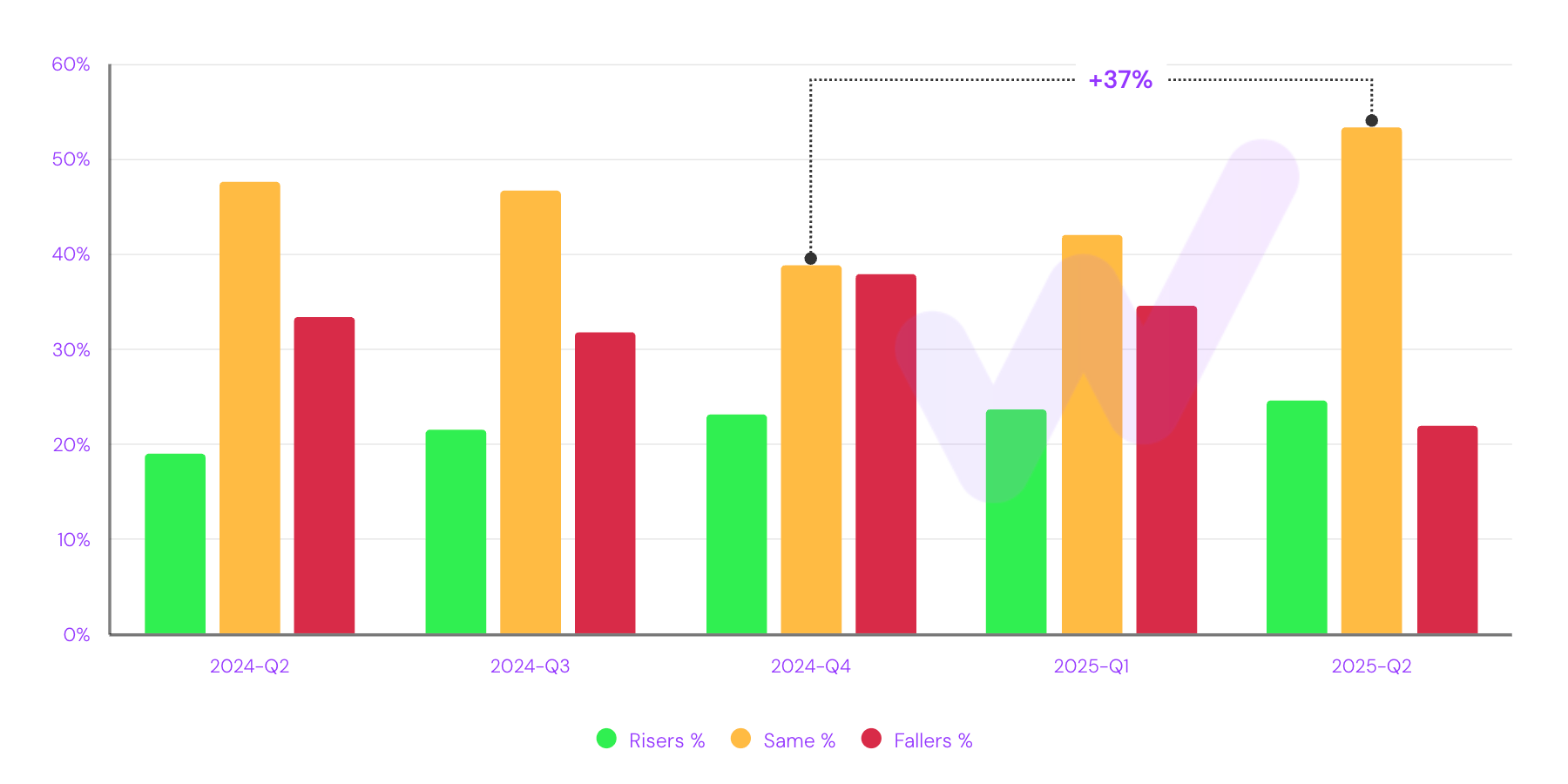 The proportion of assets with unchanged pricing has risen steadily from 38.89% in Q4 2024 to 53.40% in Q2 2025 – a 37% relative increase. This shift suggests reduced volatility and a reversion to more typical trading conditions, as merchants appear less inclined to cut offers.